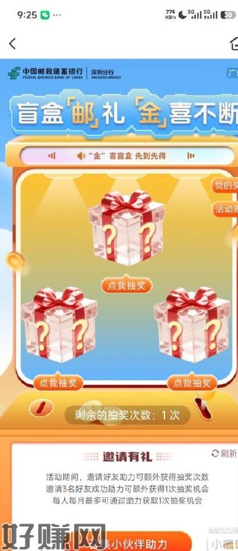 限深圳邮.储app搜【本地优惠】 下拉盲.盒邮礼,金喜不断 去抽试试 有反馈1.8立减J ​