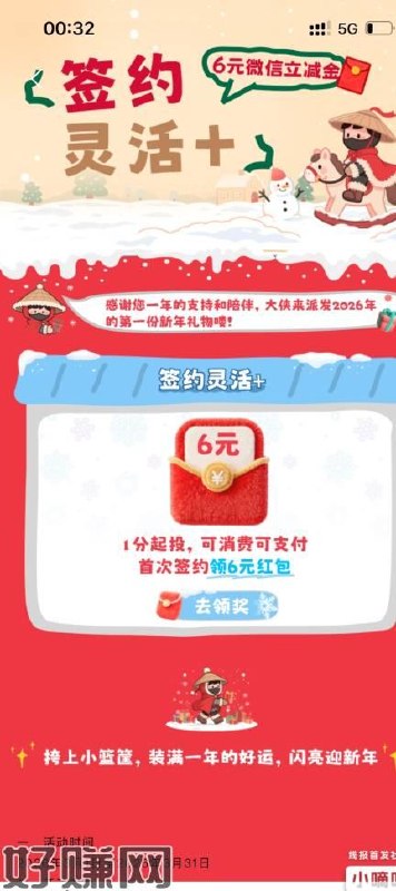 铺发 6立减金2026年3月31日前,首次签约灵活+可抽取6元微信立减金,活动参与链接
