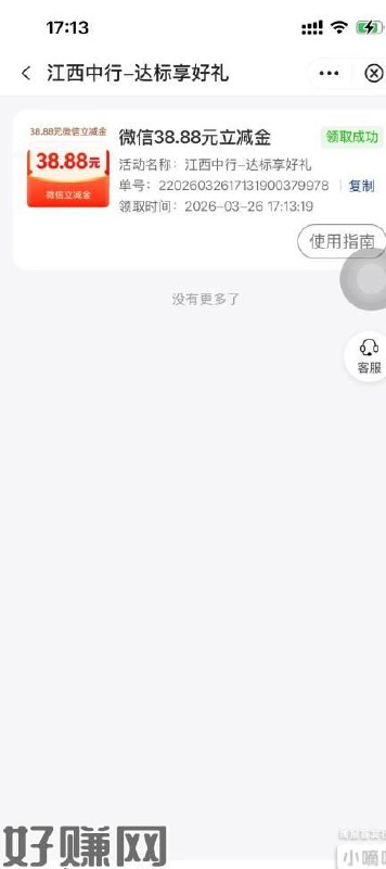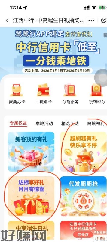 有中行信用卡江西的可以去看看这个,生活-本地专属-信用卡专区-达标享好礼月月有惊喜,刚中38.88低保,越刷越有礼也记得报一下名也有抽奖